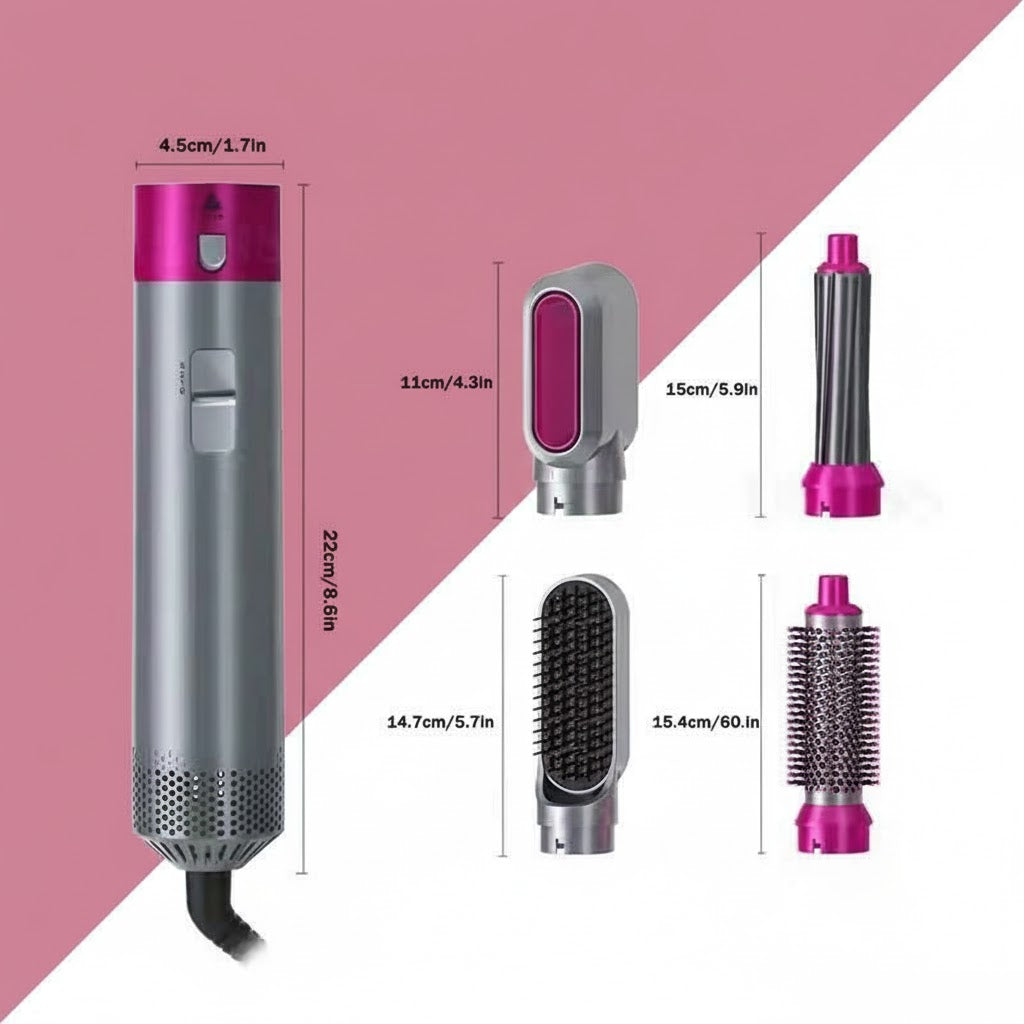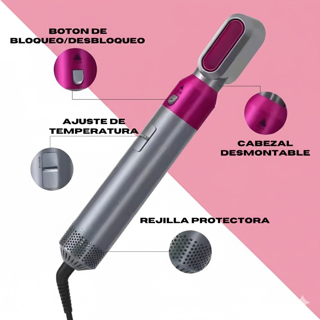 - 5 cabezales intercambiables: Secador, cepillo alisador, cepillo volumen, 2 rulos rizadores